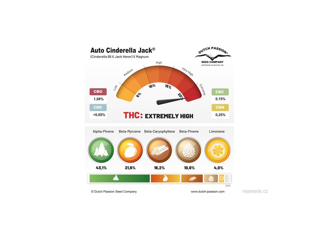 Cinderella Jack je nejsilnější samokvetoucí květina z kolekce a pravděpodobně i nejsilnější samokvetoucí květina na světě! S procentem THC téměř 26%, ověřeným 2 nezávislými laboratořemi (metodou HPLC), je samozřejmé, že tato semena konopí poskytnou velmi silné efekty.