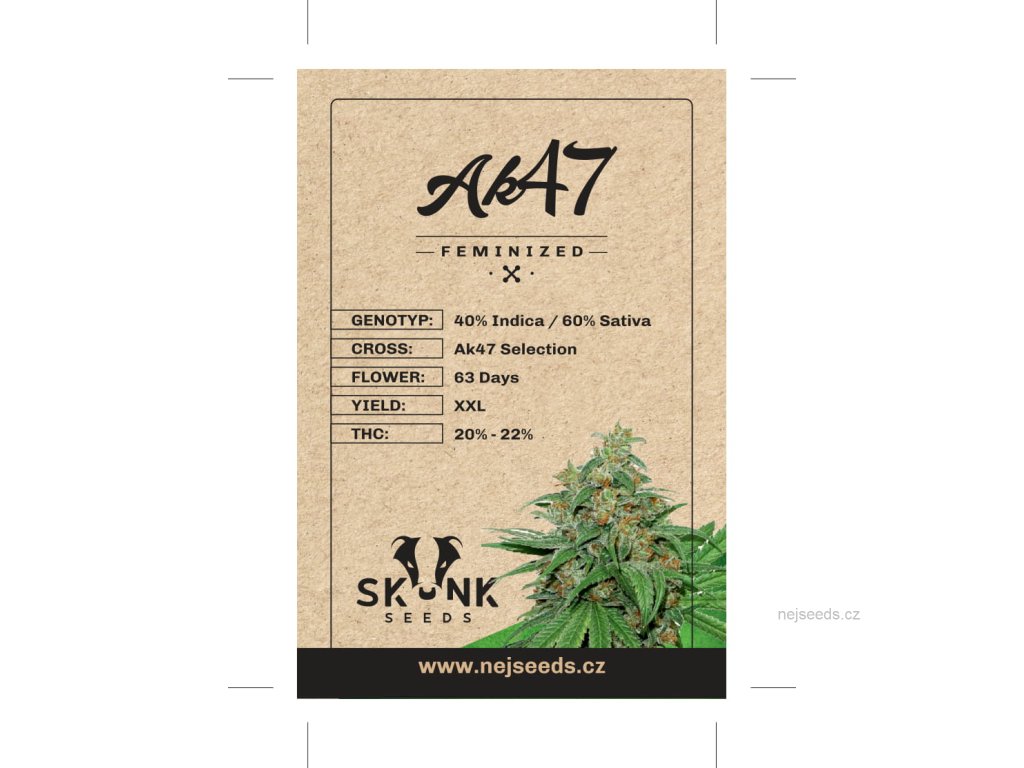 Skunk Seeds AK47 feminizovaná verze. Skunk Seeds AK47 je speciální genetická linie, která byla nalezena po vypěstování stovek AK47 rostlin ze semen. AK47 produkuje velmi silné, pryskyřičné rostliny s velkými kompaktními palicemi. Obsah THC je vysoký a pohybuje se okolo 22%.